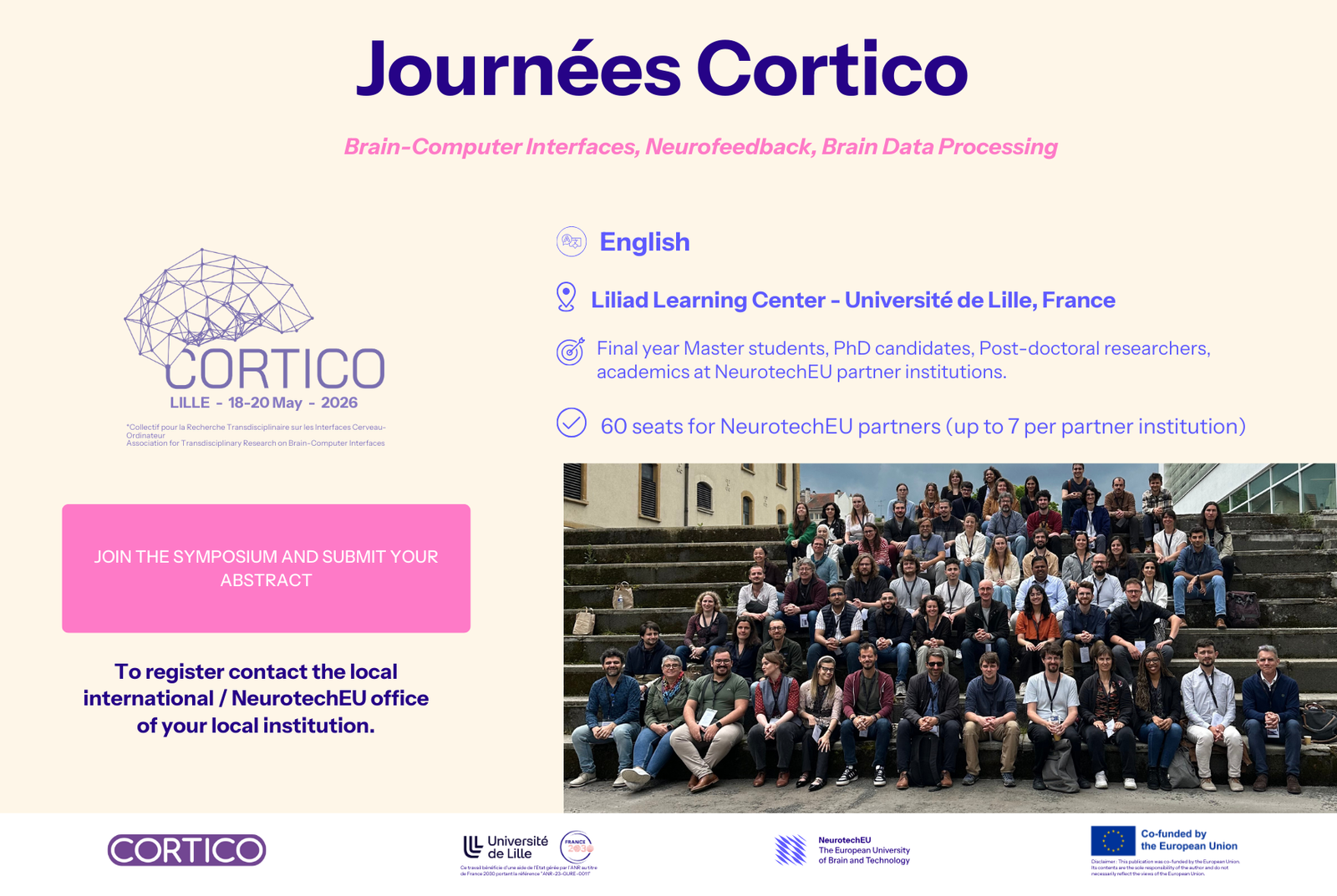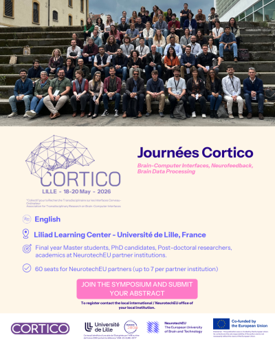 The symposium "Journées CORTICO 2026" will take place on May 18–20, 2026, at the LILLIAD Learning Center in the scientific campus of the University of Lille, France. This annual symposium brings together researchers across the world to present their work in brain-computer interfaces, neurotechnology, and cognitive neuroscience.