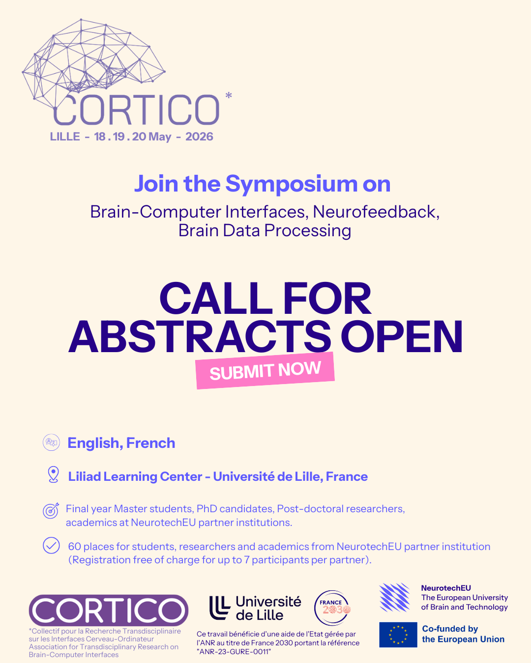 The Journées CORTICO 2026 conference will take place from 18 to 20 May 2026 at the University of Lille, France. This flagship scientific event brings together the research communities in Brain-Computer Interfaces (BCI), neurotechnology, and cognitive neuroscience for three days of presentations, discussions, and networking. The 2026 edition will mark a major milestone with the 20th anniversary of BCI research in France, offering a unique opportunity to reflect on two decades of scientific progress while addressing current and future challenges in the field. The conference will be held in two languages, French and English, with live interpretation provided throughout the event, ensuring full accessibility for an international audience.