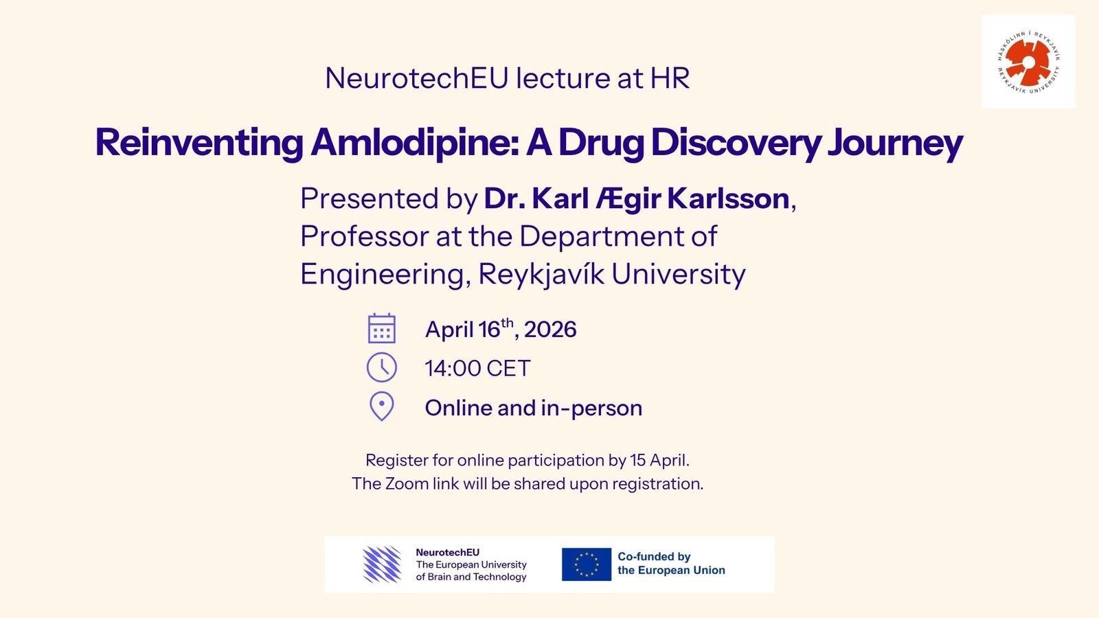 This lecture is part of the HR NeurotechEU Lectures series. In this session, Prof. Karl Ægir Karlsson (Department of Engineering, Reykjavík University) presents a drug discovery journey exploring the repositioning of amlodipine as a potential treatment for ADHD.