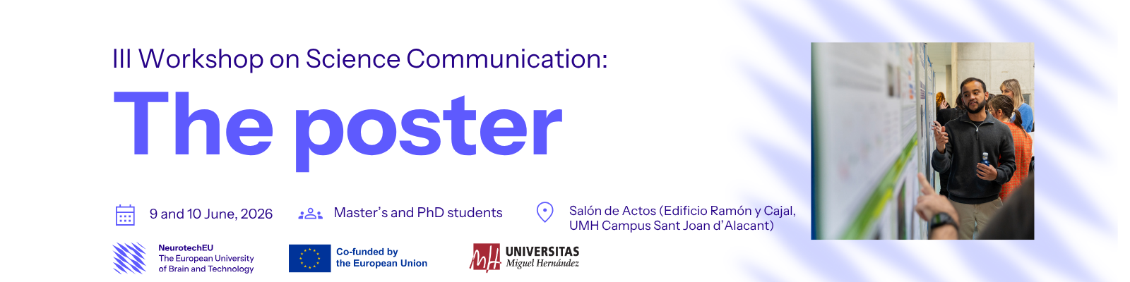 Modern scientific development is inextricably linked to its communication; sharing results or ongoing research is essential for attracting sponsors, establishing new collaborations, or generating debate with specialists in the same field and related disciplines. A key tool for all these actions is the scientific poster. With this in mind, the UMH Synapses Club has organised the 3rd edition of the UMH Workshop on Science Communication, specifically focusing on the poster—one of the most widely used formats for presenting research projects.