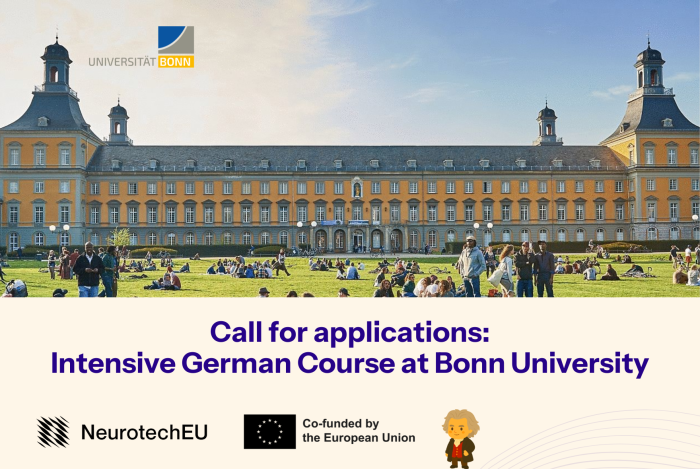 The University of Bonn is pleased to announce that, for the eigth time, it will be awarding 8 scholarships to NeurotechEU students (BA, MA, PhD) from partner universities. These scholarships are for the Intensive German language course scheduled for March 2026.